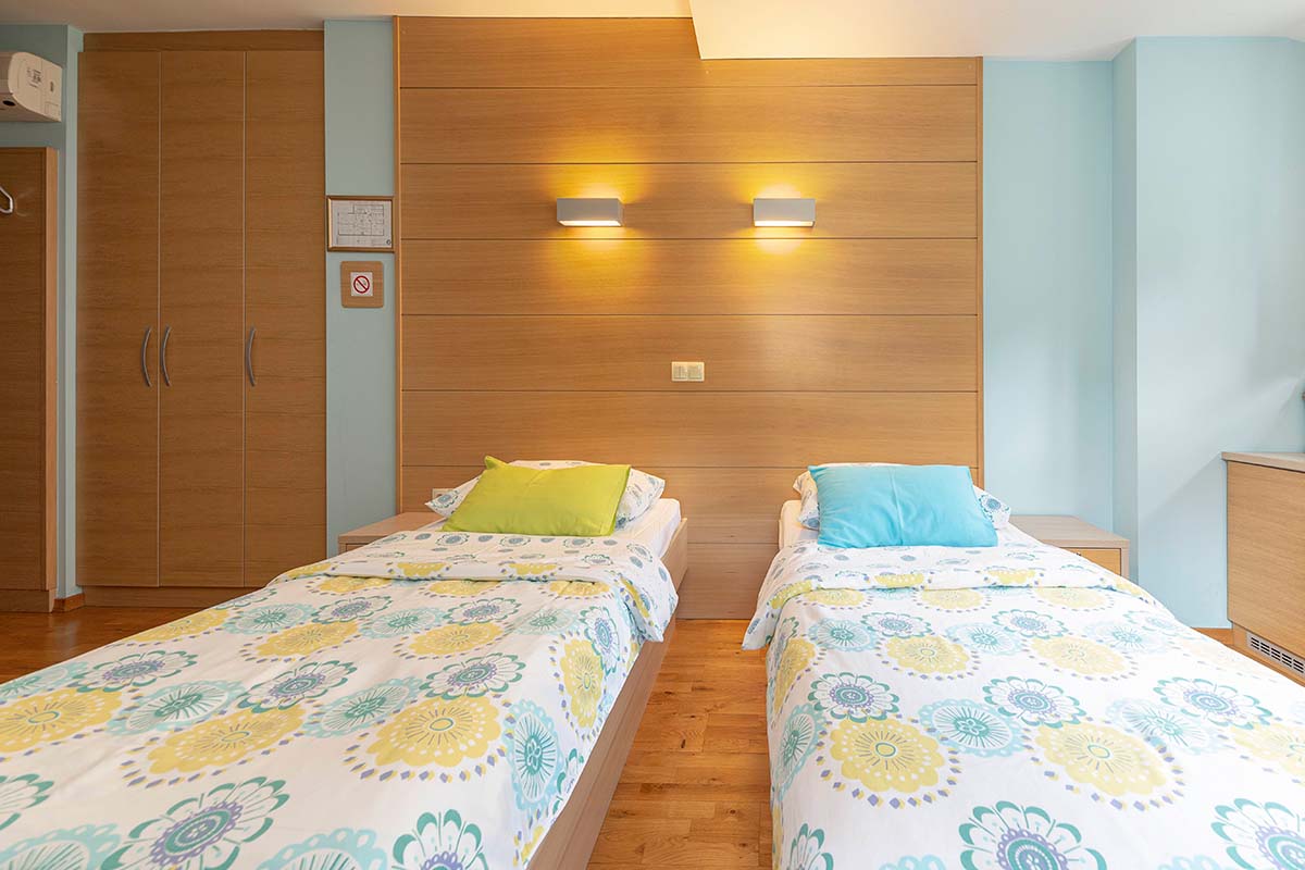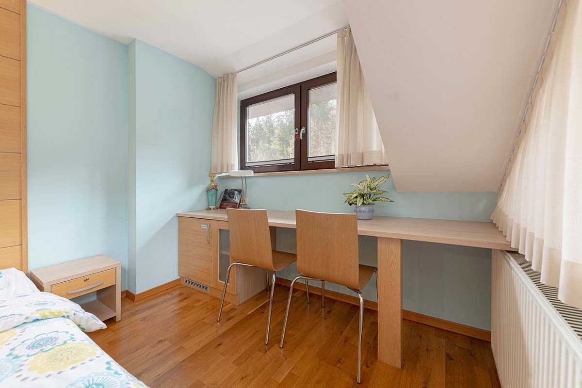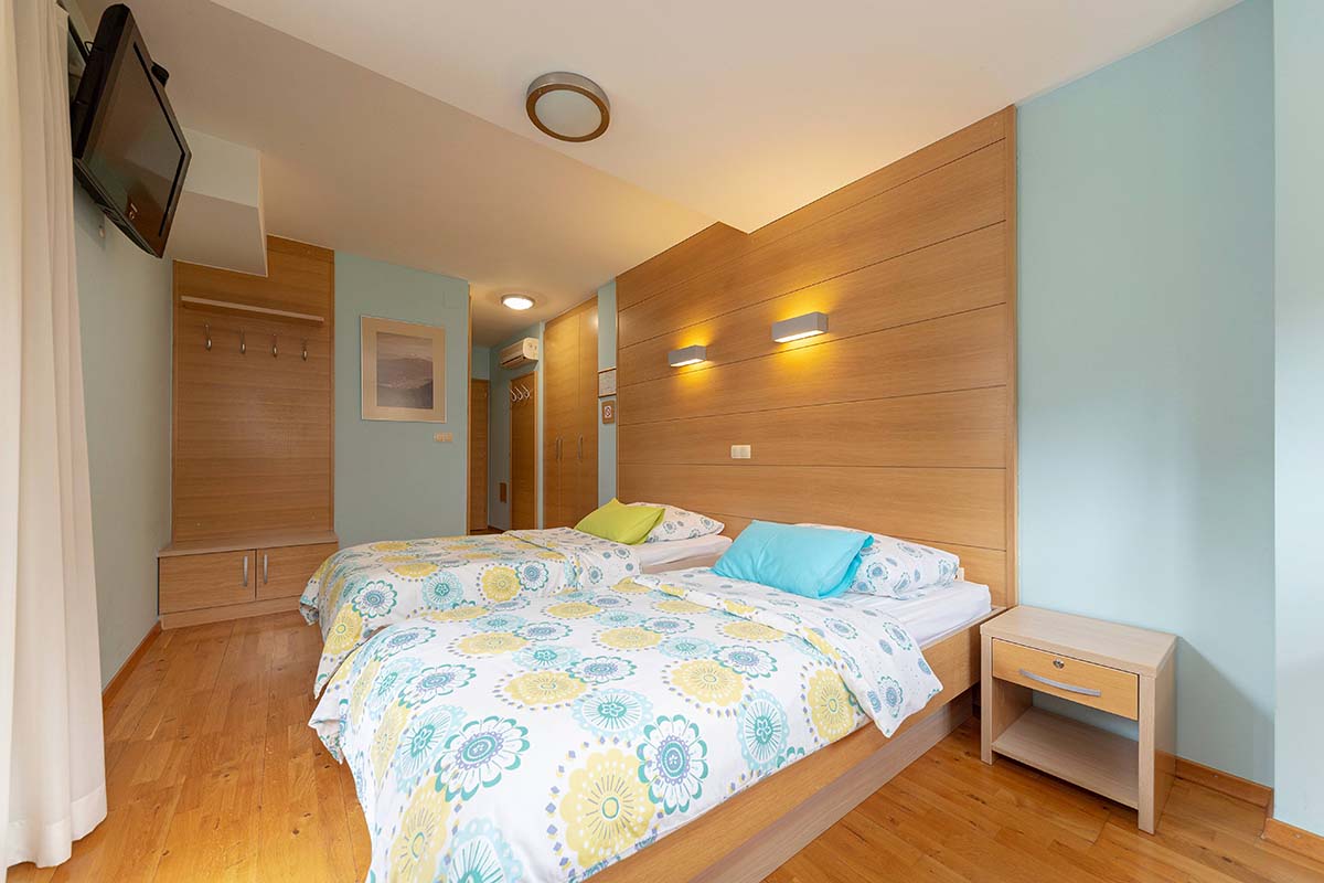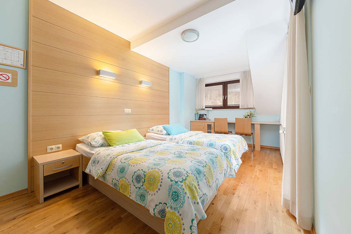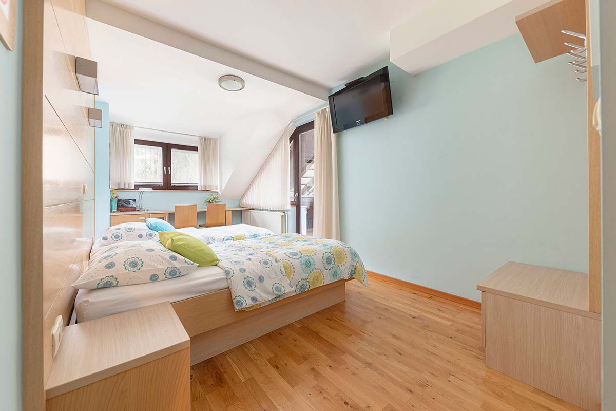 Naša sodobno zasnovana dvoposteljna soba z udobno zakonsko posteljo nudi popoln pobeg v naravo, kjer se skozi okno odpira pomirjujoč pogled na valove Poljanske Sore, zeleno zavetje gozda in cvetoče travnike. Da bi bila vaša sprostitev popolna, je ambient v celoti klimatiziran in namenjen nekadilcem, kopalniški del pa vključuje funkcionalno tuš kabino in urejen WC prostor.