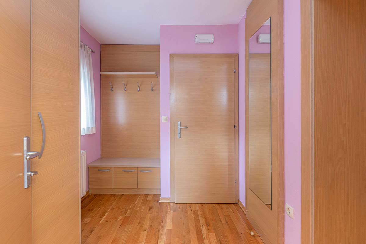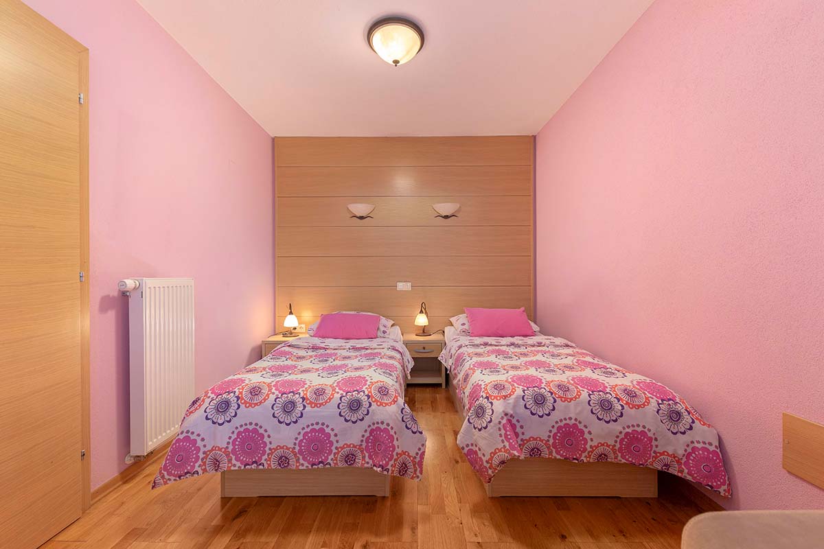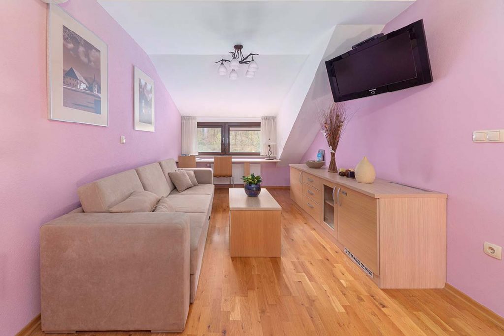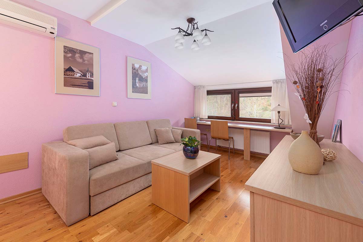 Prepustite se miru in udobju v sodobno opremljeni dvoposteljni sobi z zakonsko posteljo, kjer se prepletata eleganca in toplina narave. Ob jutrih vas bo razvajal pogled na Poljansko Soro, gozd in travnik, ki ustvarjajo popolno kuliso za sproščen oddih ali romantičen pobeg.