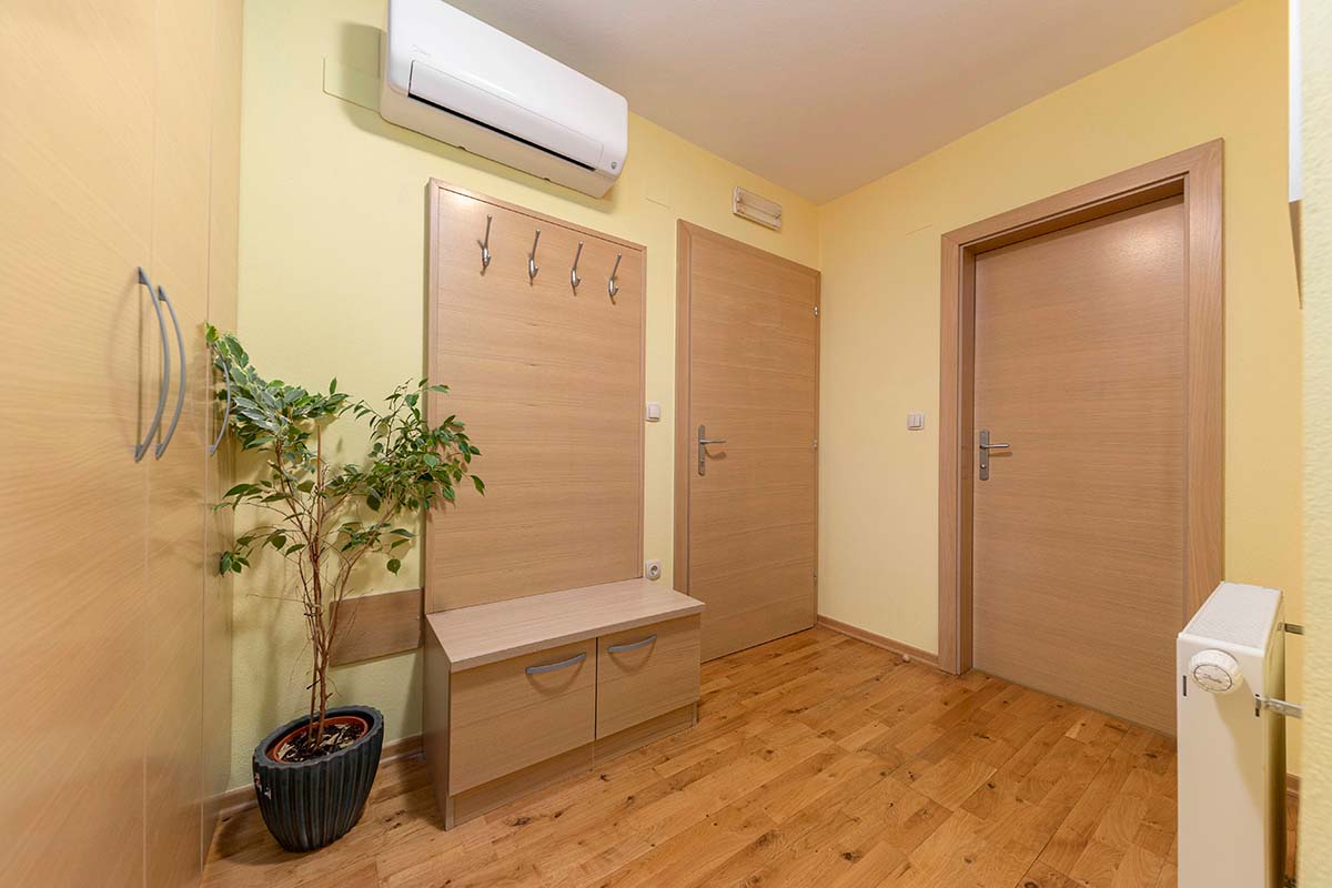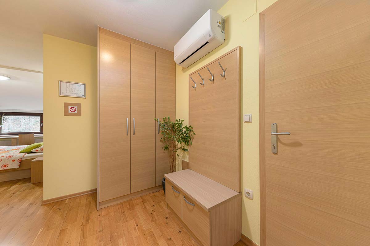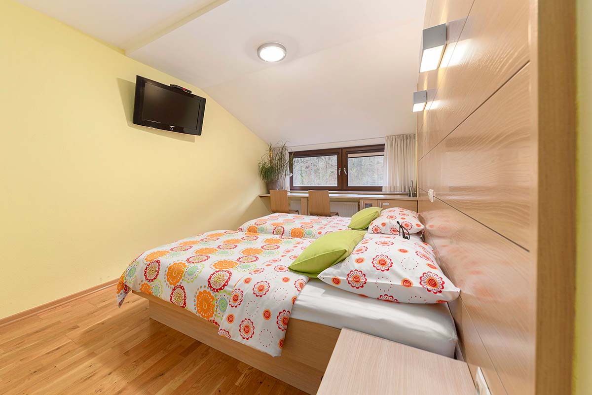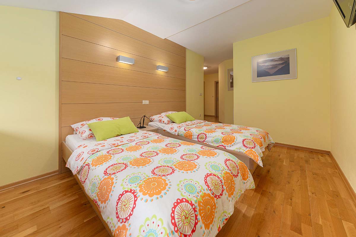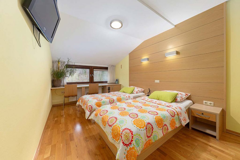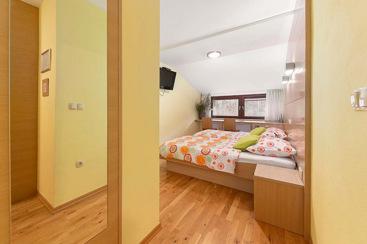 Stopite v svet miru, kjer se sodobno bivanje prepleta z naravno lepoto Poljanske doline. Naša sodobno opremljena dvoposteljna soba z zakonsko posteljo ponuja vse, kar potrebujete za brezskrben in sproščujoč oddih. Prebudite se ob pogledu na Poljansko Soro, okoliški gozd in travnik, ter dan začnite v popolnem ravnovesju med naravo in udobjem.