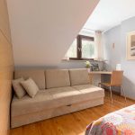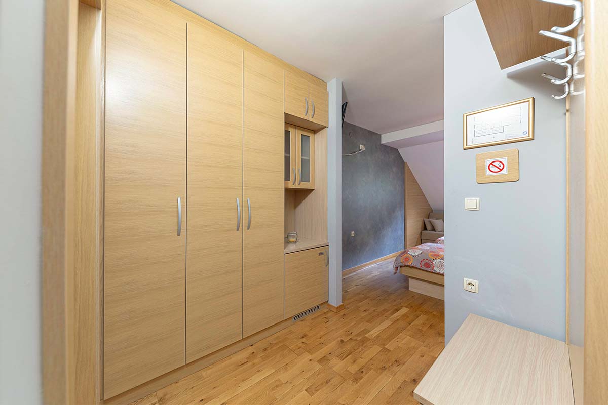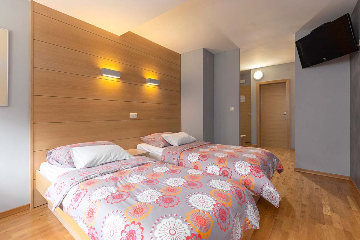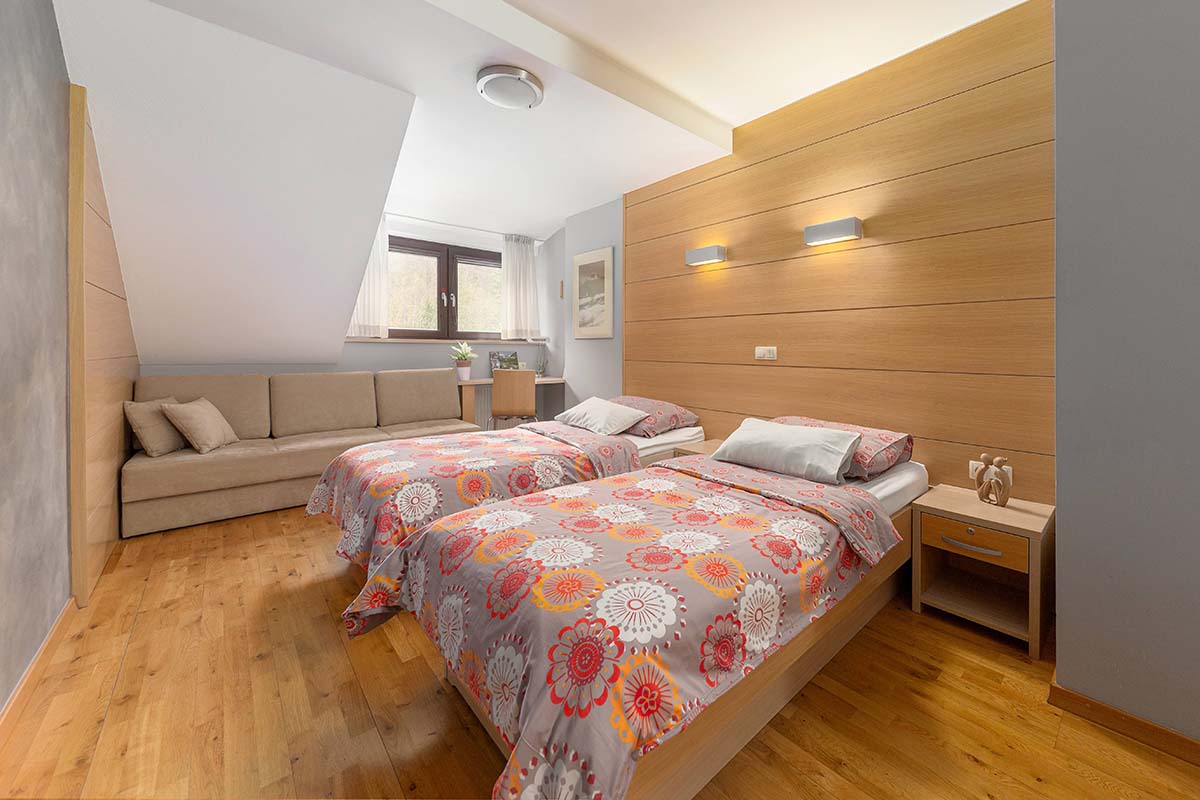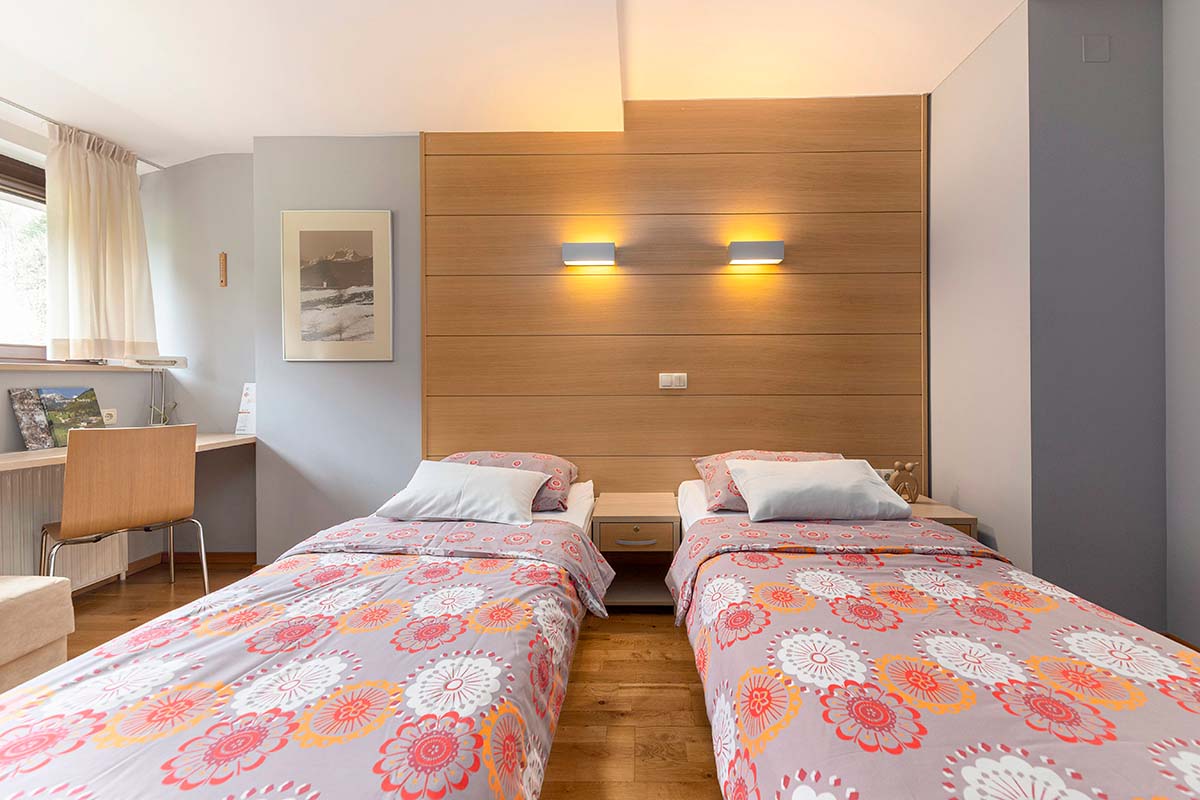 Stopite v svet miru, kjer se sodobno bivanje prepleta z naravno lepoto Poljanske doline. Naša sodobno opremljena dvoposteljna soba z zakonsko posteljo ponuja vse, kar potrebujete za brezskrben in sproščujoč oddih. Prebudite se ob pogledu na Poljansko Soro, okoliški gozd in travnik, ter dan začnite v popolnem ravnovesju med naravo in udobjem.